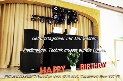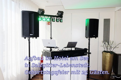 Der optisch ansprechende Aufbau mit Sound- und Lichttechnik beginnt zwei Stunden, bevor Sie und Ihre Gäste im Saal eintreffen. Backup: ein Laptop und DJ-Controller. Im Oktober 2025 wurden zwei neue Subwoofer und Laptops gekauft.